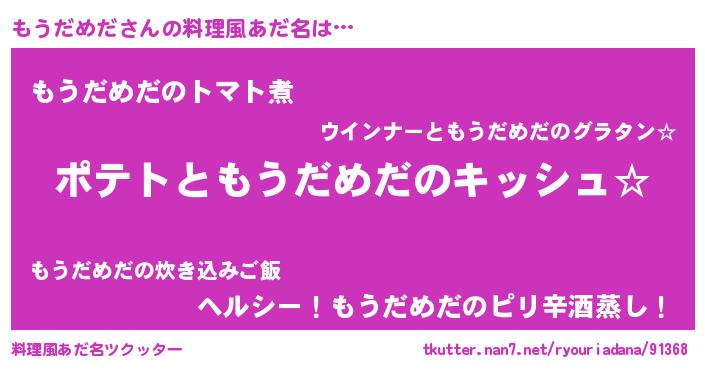 | 女子向けラノベタイトル風あだ名 | 『もうだめだの卵を拾いまして』 |