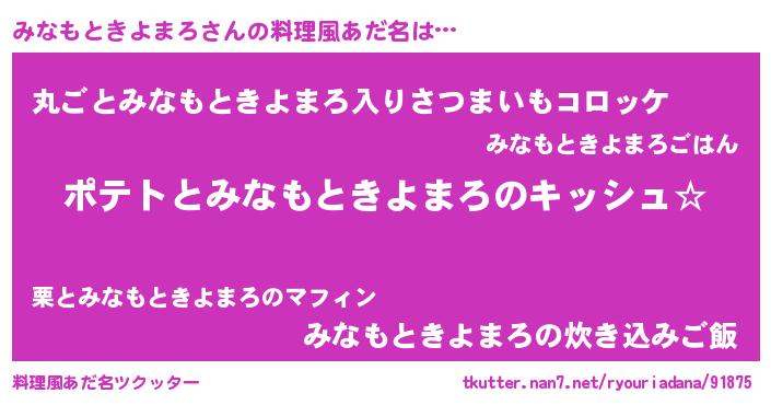 | 男性向けラノベタイトル風あだ名 | 『みなもときよまろの嫁は女の子じゃないと思った?』 |