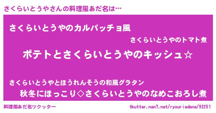 | 女子向けラノベタイトル風あだ名 | 『さくらいとうやの卵を拾いまして』 |