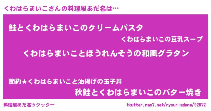 | ヘコむあだ名 | 『くわはらまいこ(小並感)』『くわぷりん』 |