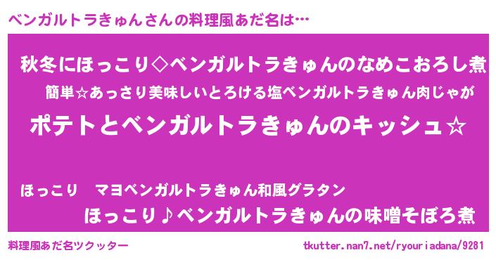 | 女子向けラノベタイトル風あだ名 | 『ベンガルトラきゅんの卵を拾いまして』 |