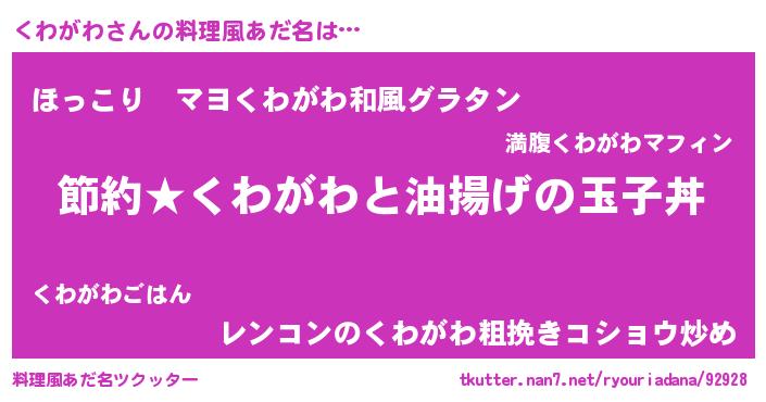 男性向けラノベタイトル風あだ名 | 『くわがわの憂鬱』『クワガワスレイヤー』 |