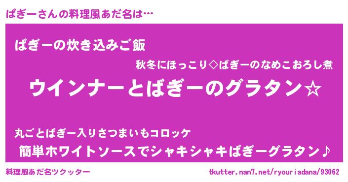 | 女子向けラノベタイトル風あだ名 | 『ばぎー伯爵の花嫁』『ばぎー様がみてる』 |