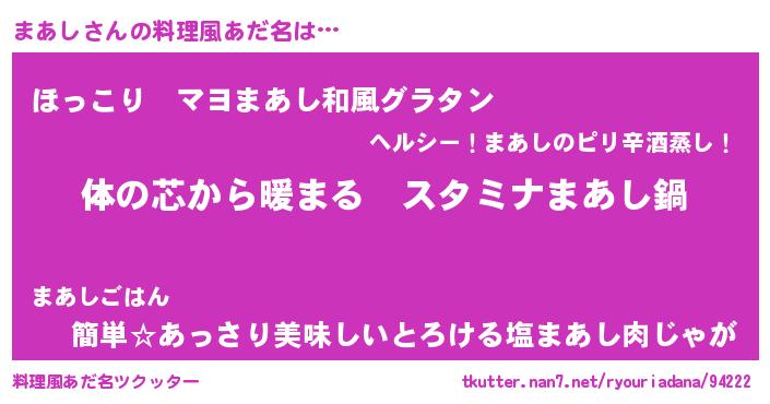 | 女子向けラノベタイトル風あだ名 | 『まあしの雑貨屋さん』『闇のまあし』 |