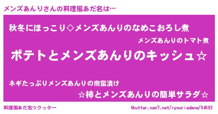 | 女子向けラノベタイトル風あだ名 | 『メンズあんりの卵を拾いまして』 |