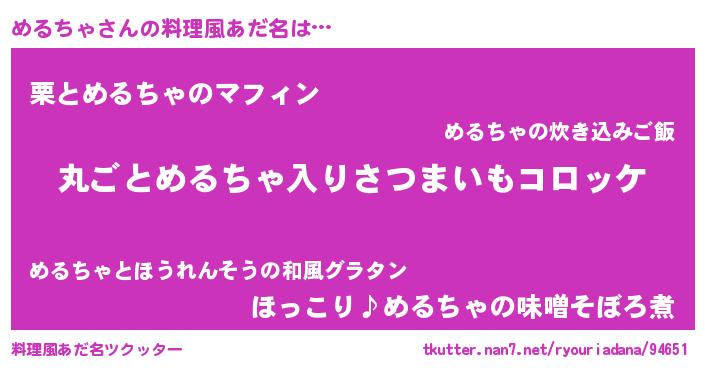 | 男性向けラノベタイトル風あだ名 | 『魔弾の王とめるちゃ』『めるちゃの憂鬱』 |