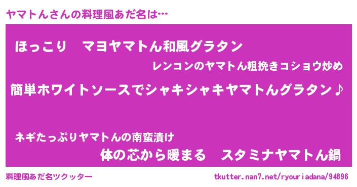 | 男性向けラノベタイトル風あだ名 | 『ヤマトんの嫁は女の子じゃないと思った?』 |