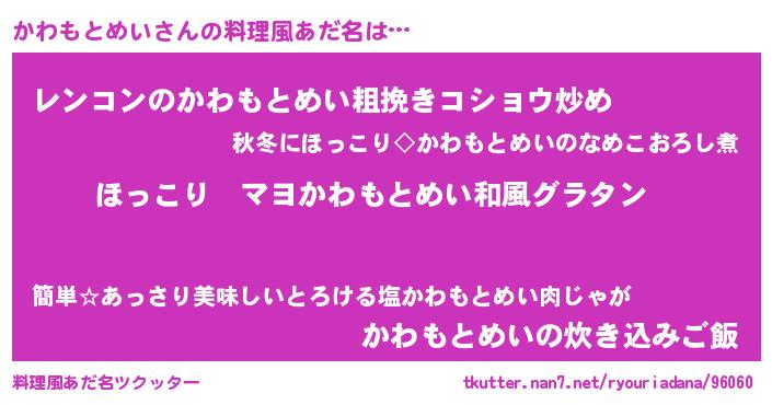 | 男性向けラノベタイトル風あだ名 | 『この素晴らしい世界にかわもとめいを!』 |