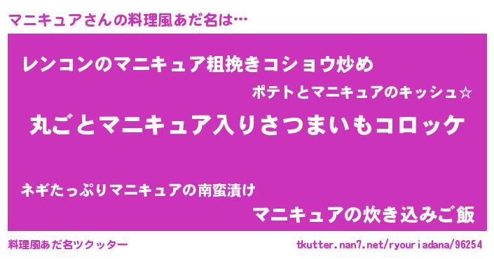 | 女子向けラノベタイトル風あだ名 | 『乙女ゲームの破滅フラグしかない悪役マニキュアに転生してしまった…』 |