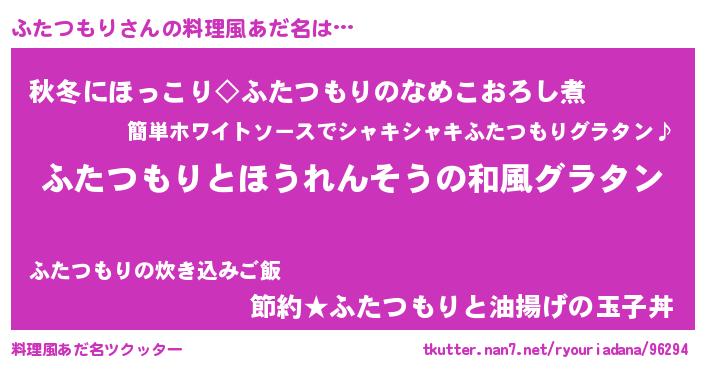 | 男性向けラノベタイトル風あだ名 | 『ふたつもり~年齢イコール彼女いない歴の魔法使い~』 |