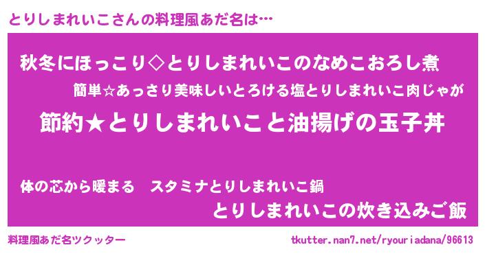 | 男性向けラノベタイトル風あだ名 | 『トリシマレイコアートオンライン』 |