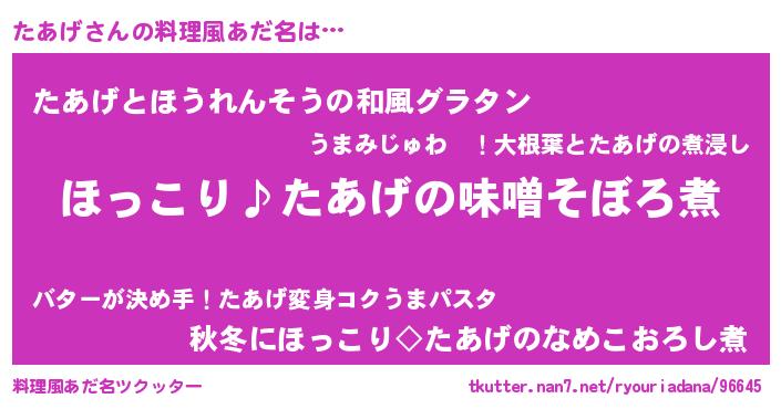 | 女子向けラノベタイトル風あだ名 | 『(仮)たあげのやんごとなき事情』 |
