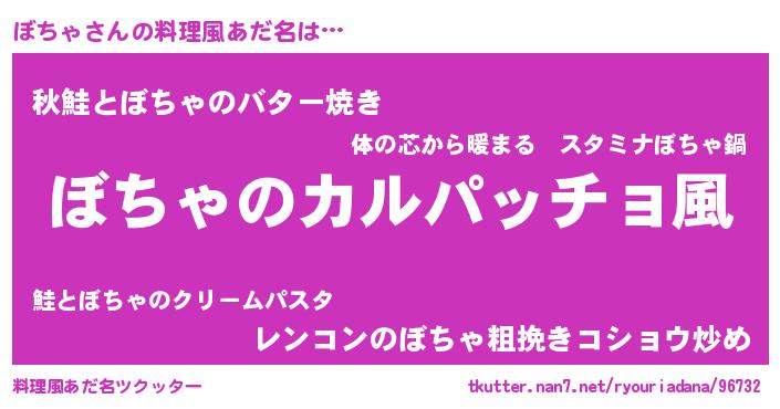 | ヒーロー風カッコイイあだ名 | 『仮面ボチダー』『ネオボチャ』 |