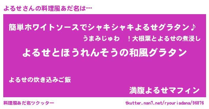 | 意味不明あだ名 | 『ニラ科よるせ属』『永久保存よるせ』 |