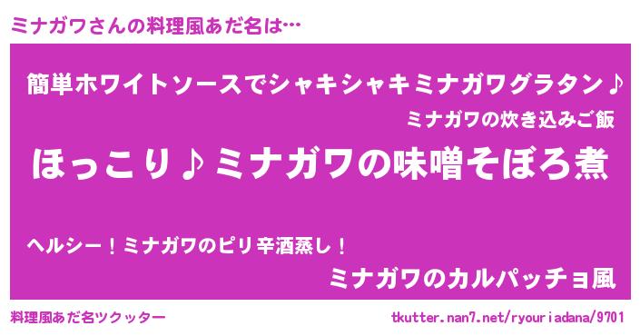 | 男性向けラノベタイトル風あだ名 | 『ミナガワの憂鬱』『魔弾の王とミナガワ』 |