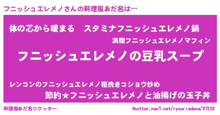 | 男性向けラノベタイトル風あだ名 | 『ダンジョンにフニッシュエレメノを求めるのは間違っているだろうか』 |