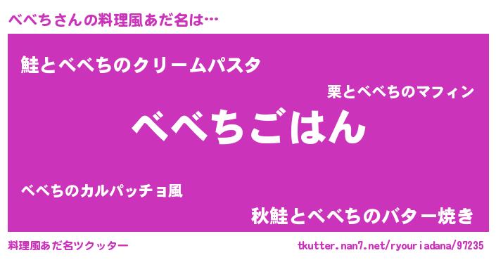 | 男性向けラノベタイトル風あだ名 | 『ベベチスレイヤー』『魔弾の王とべべち』 |