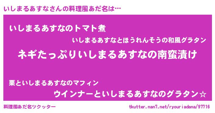 | 胡散臭い通販商品みたいなあだ名 | 『億万長者になれるブレスレット…その名も「いしまるあすな」』 |