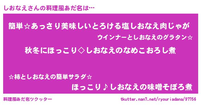 | 男性向けラノベタイトル風あだ名 | 『しおなえに滅ぼされるだけの簡単なお仕事です』 |