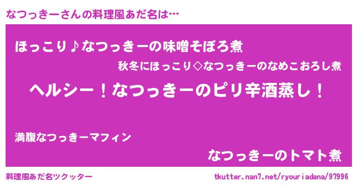 | 男性向けラノベタイトル風あだ名 | 『Re:なつっきーから始める異世界生活』 |