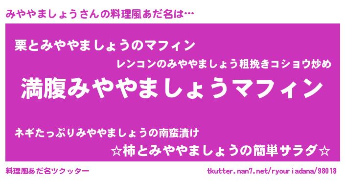 | 胡散臭い通販商品みたいなあだ名 | 『絶対に幸福をもたらす水素水…その名も「みややましょう」』 |