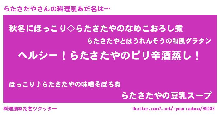 | 男性向けラノベタイトル風あだ名 | 『Re:らたさたやから始める異世界生活』 |