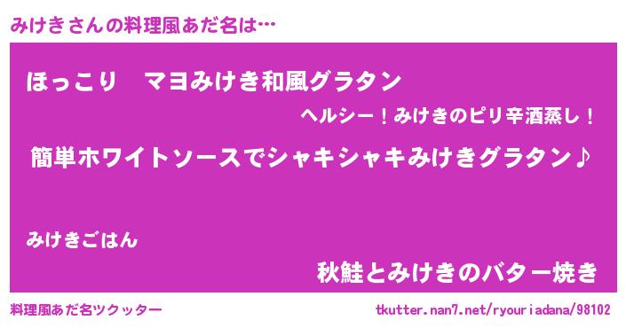 | 女子向けラノベタイトル風あだ名 | 『みけき様がみてる』『みけきの契約王妃』 |