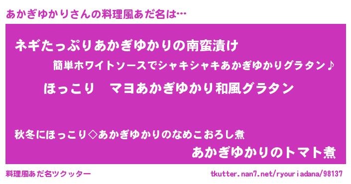 | 意味不明あだ名 | 『住所不定無職あかぎゆかり(47歳)』 |