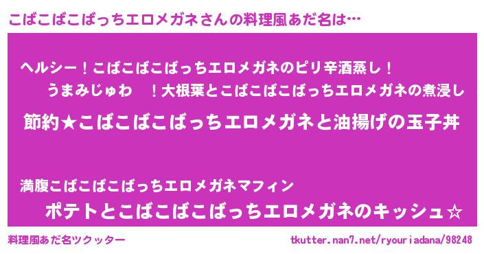 | 女子向けラノベタイトル風あだ名 | 『こばこばこばっちエロメガネ姫と円卓の騎士』 |