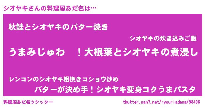 | 女子向けラノベタイトル風あだ名 | 『シオヤキの婚約者』『シオヤキ恋絵巻』 |