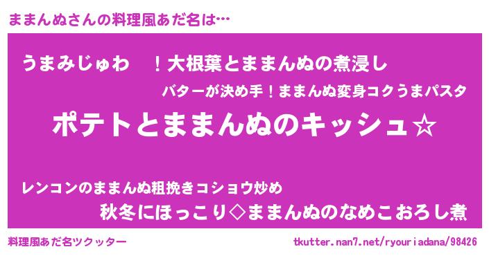 | 女子向けラノベタイトル風あだ名 | 『ままんぬの卵を拾いまして』 |