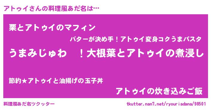 | 女子向けラノベタイトル風あだ名 | 『アトゥイの婚約者』『アトゥイ恋絵巻』 |