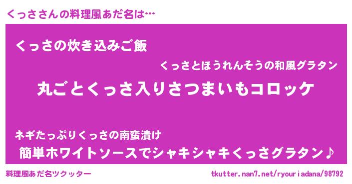 | 男性向けラノベタイトル風あだ名 | 『この素晴らしい世界にくっさを!』 |