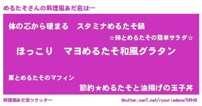| 男性向けラノベタイトル風あだ名 | 『この素晴らしい世界にめるたそを!』 |