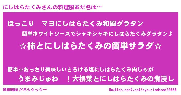 | 意味不明あだ名 | 『住所不定無職にしはらたくみ(40歳)』 |