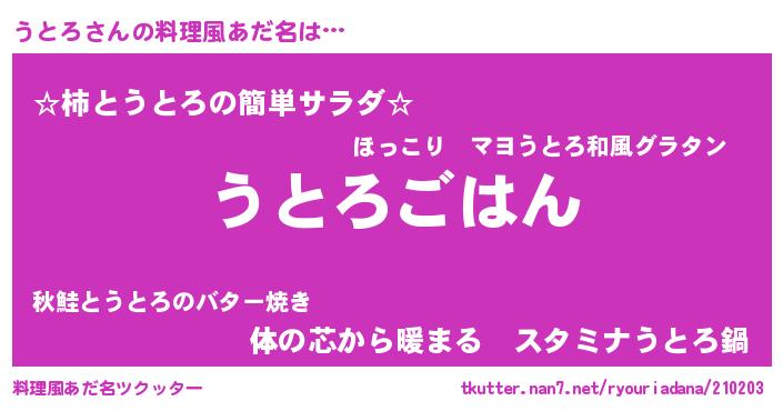 | 意味不明あだ名 | 『なめこ科うとろ属』『永久保存うとろ』 |