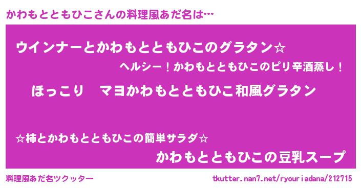 | 男性向けラノベタイトル風あだ名 | 『この素晴らしい世界にかわもとともひこを!』 |