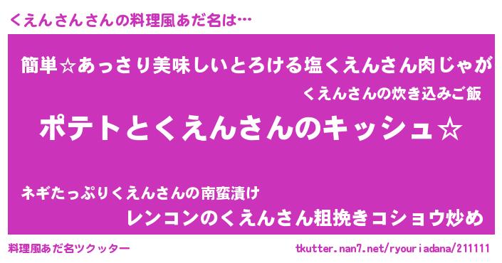 | 女子向けラノベタイトル風あだ名 | 『くえんさんの卵を拾いまして』 |