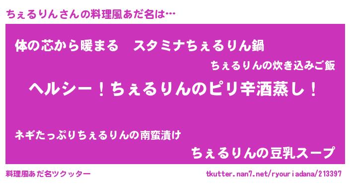 | 男性向けラノベタイトル風あだ名 | 『Re:ちぇるりんから始める異世界生活』 |