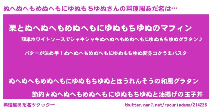| 男性向けラノベタイトル風あだ名 | 『おまえをオタクにしてやるから、俺をぬへぬへもめぬへもにゆぬもちゆぬにしてくれ! 』 |