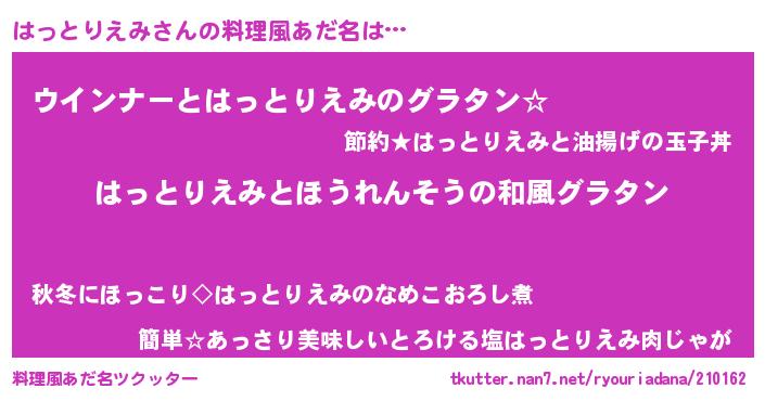 | 女子向けラノベタイトル風あだ名 | 『はっとりえみの玉の輿計画!』 |