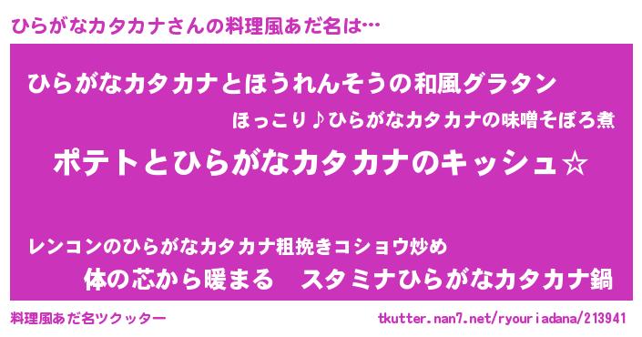 | 女子向けラノベタイトル風あだ名 | 『ひらがなカタカナの卵を拾いまして』 |