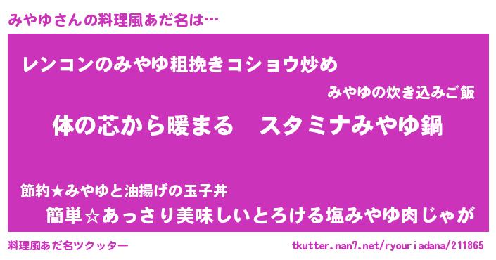 | 欧米人風あだ名 | 『みやゆクリステル』『マイケルみやゆ』 |