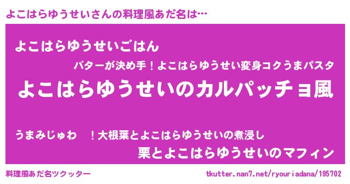 | 男性向けラノベタイトル風あだ名 | 『魔弾の王とよこはらゆうせい』 |