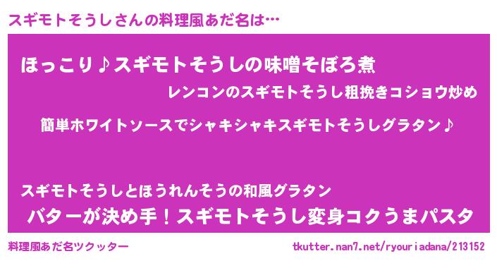 | 男性向けラノベタイトル風あだ名 | 『スギモトそうしの嫁は女の子じゃないと思った?』 |