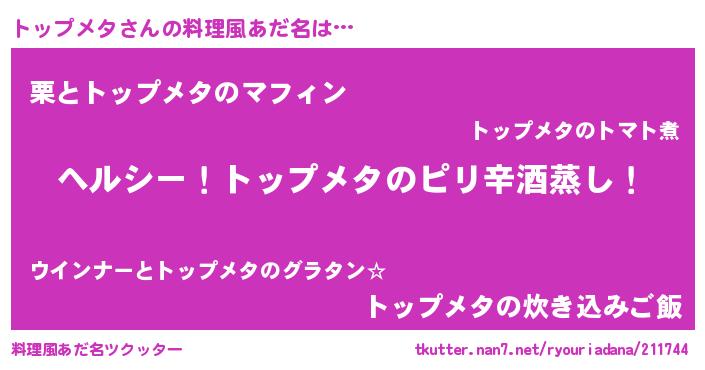 | 男性向けラノベタイトル風あだ名 | 『Re:トップメタから始める異世界生活』 |
