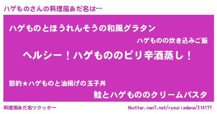 | 男性向けラノベタイトル風あだ名 | 『Re:ハゲものから始める異世界生活』 |