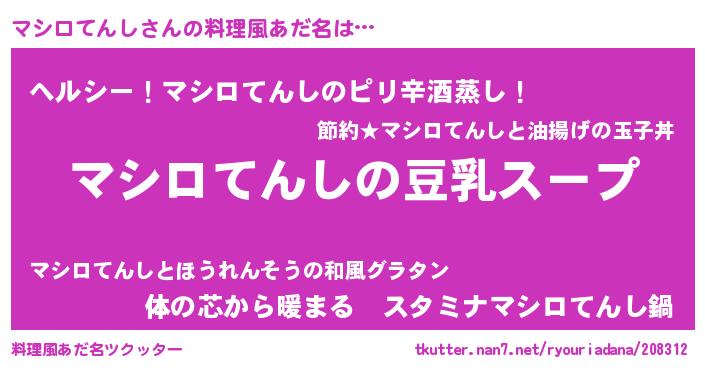 | 胡散臭い通販商品みたいなあだ名 | 『信頼と実績のサプリメント…その名も「マシロてんし」』 |