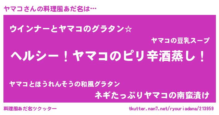 | 男性向けラノベタイトル風あだ名 | 『Re:ヤマコから始める異世界生活』 |