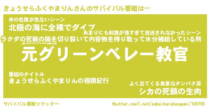 | 欧米人風あだ名 | 『マイケルきょうせらふくやまりん』 |
